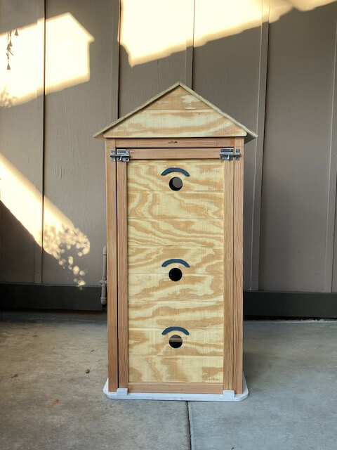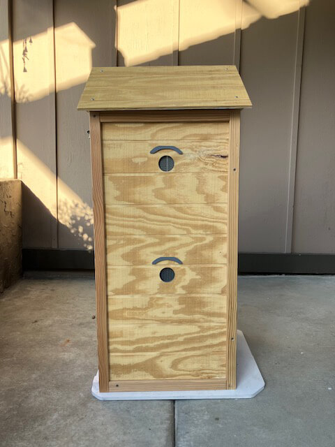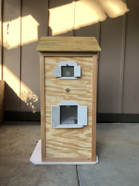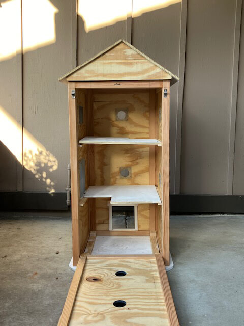 Outdoor safe; roof and floors are made of pine plywood, main house is made of 4” groove pine plywood panel siding with strong high-grade doug-fir trim around each panel